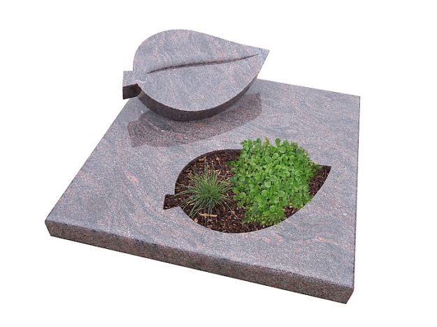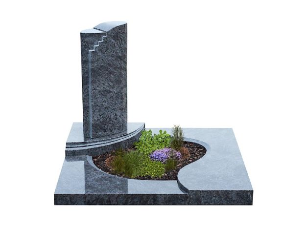 Form U-86.13 Urnengrabanlage aus poliertem Orion Granit mit Ausschnitt für Bepflanzung in geschwungener Form, mit breiten Fasen am Übergang zu den beiden massiven Liegeplatten in unterschiedlichen Höhen. Modern gestaltetes Grabdenkmal mit erhöhtem Sockelteil.